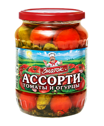 Овощи (томаты, огурцы), маринад (вода питьевая, сахар, соль, регулятор кислотности (уксусная кислота), зелень, чеснок, специи